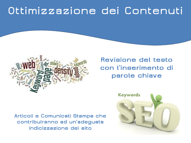 Negli ultimi anni abbiamo acquisito l'esperienza necessaria per potere offrire ad Aziende e Professionisti un servizio che si dedica esclusivamente all'ottimizzazione dei contenuti sia del vostro sito che di vostri eventuali articoli o comunicati stampa che intendete pubblicare; lo staff di cui disponiamo è composto da persone che prima di ogni altra cosa amano scrivere e grazie all'ausilio di strumenti professionali potranno contribuire sensibilmente alla corretta indicizzazione e promozione dei vostri contenuti.