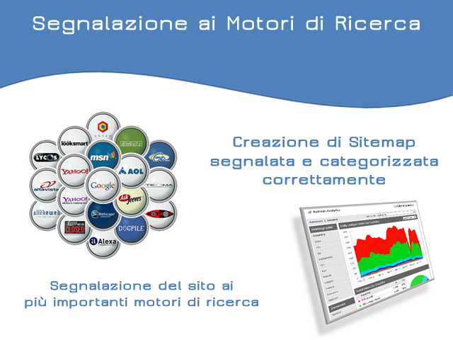 Dopo un'attenta analisi del tuo sito Web provvederemo a creare la sitemap e a segnalarlo correttamente ai Motori di ricerca categorizzandolo nel modo corretto; successivamente provvedermo all'installazione di codici di monitoraggio Analytics che ti permetteranno di visionarne le visite e le principali Query di ricerca attraverso le quali i tuoi visitatori arrivano al tuo sito, affinche tu possa in seguito organizzare le tue campagne Marketing in modo preciso ed efficace.